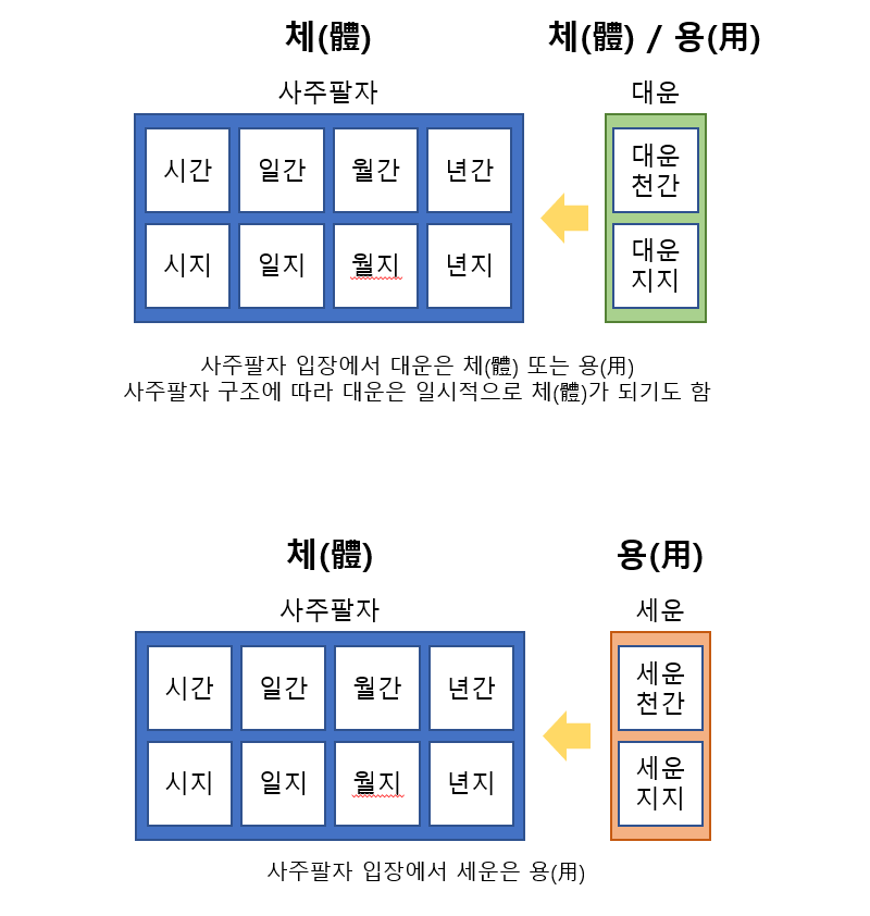 정리하면 사주팔자 여덟 글자는 체, 행운인 대운 또는 세운은 용이 됩니다. 사주(체)와 행운(용)을 함께 보아야 외부 환경인 행운이 사주에 어떤 영향을 미치는지 확인이 가능합니다.