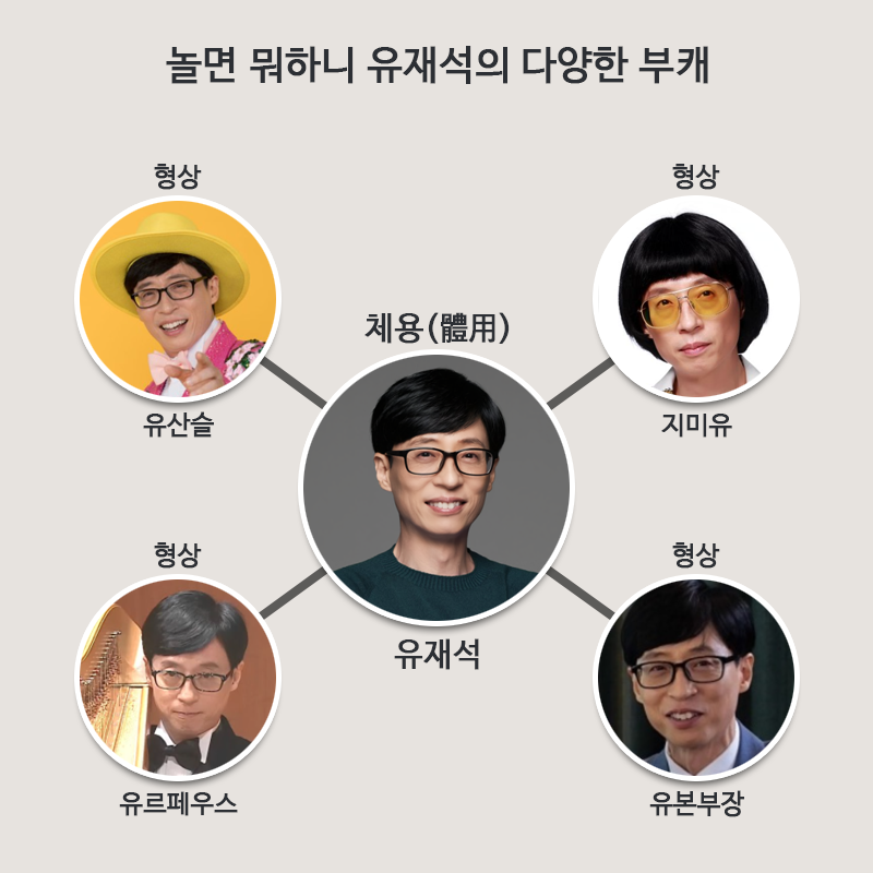 유재석 씨는 부캐의 역할로 여러 모습을 하고 있지만, 유재석 본캐(본래 캐릭터)의 특징은 변함이 없습니다. 다만 극 중에서 역할과 모습이 계속 바뀌는 것이죠. 이렇게 극 중에서 역할과 모습이 바뀌는 것이 용(用)의 형상 변화입니다.