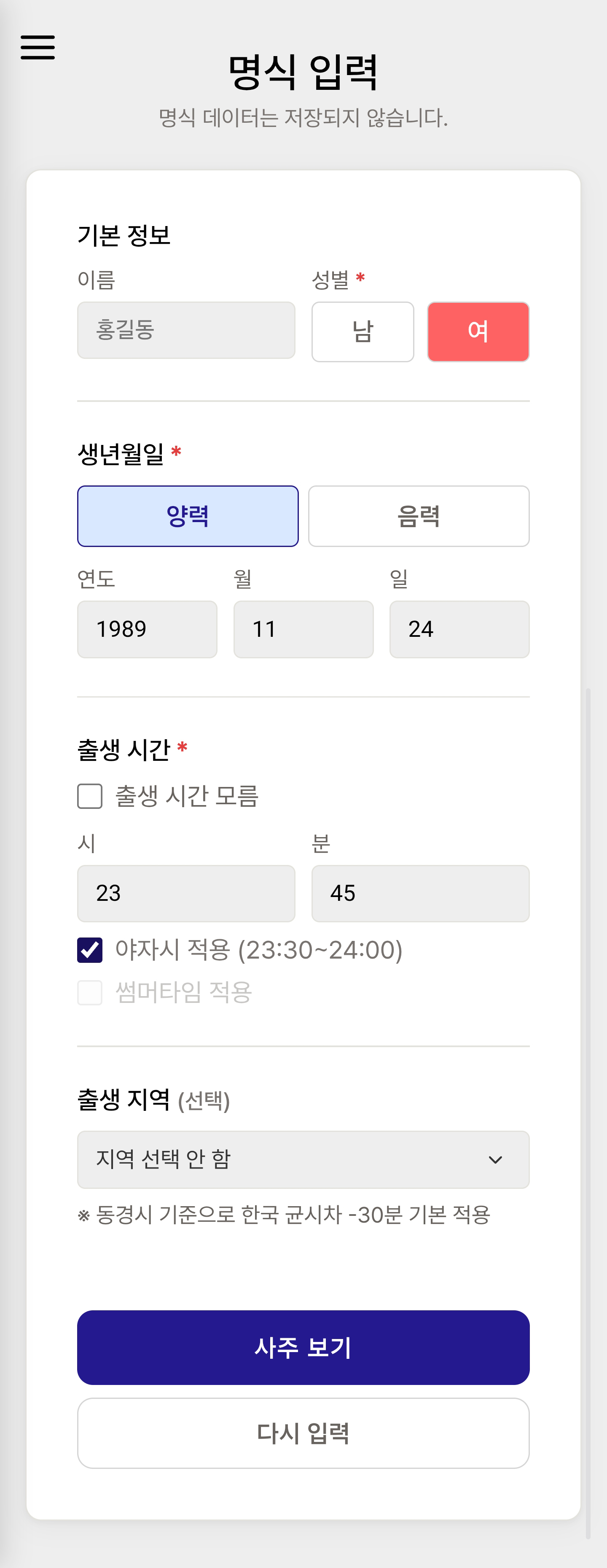 - 대한민국 일광절약시간제(썸머타임) 실시 기간인 1948~1960년, 1987~1988년에 출생한 경우, '썸머타임 적용'을 선택하면 기록된 출생 시간에서 1시간을 차감하여 진태양시 기준으로 사주를 계산합니다. 해당 기간의 날짜와 시간을 입력하면 자동으로 활성화됩니다.