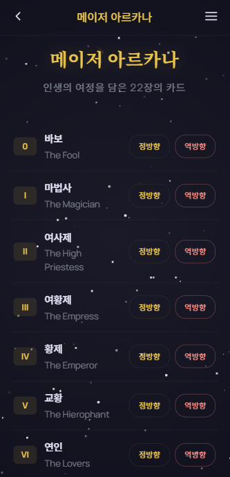 각 카드는 정방향/역방향을 별도의 상세 팝업으로 열람하실 수 있습니다.