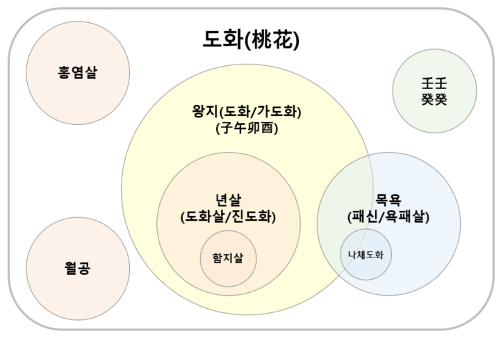 도화라는 상위 큰 카테고리가 있으면 그 아래에 도화살(년살, 함지살), 12운성 목욕, 홍염살, 월공 같은 신살이 포함되어 있다고 보면 됩니다.