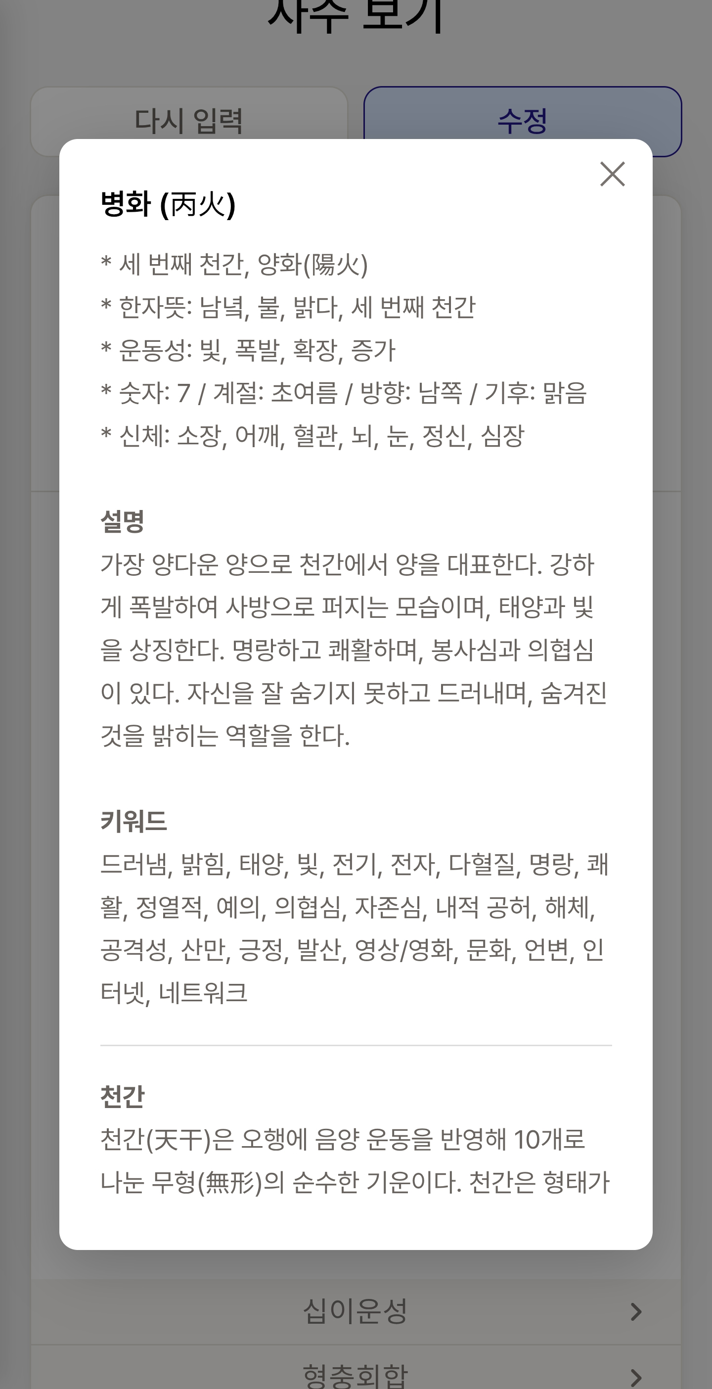 - 각 주, 천간, 지지, 납음, 십이운성, 신살 등의 요소를 클릭하면 알기 쉬운 해설을 바로 확인할 수 있습니다. 입문자에게는 학습 보조 도구로, 전문가에게는 빠른 레퍼런스로 활용할 수 있습니다.
