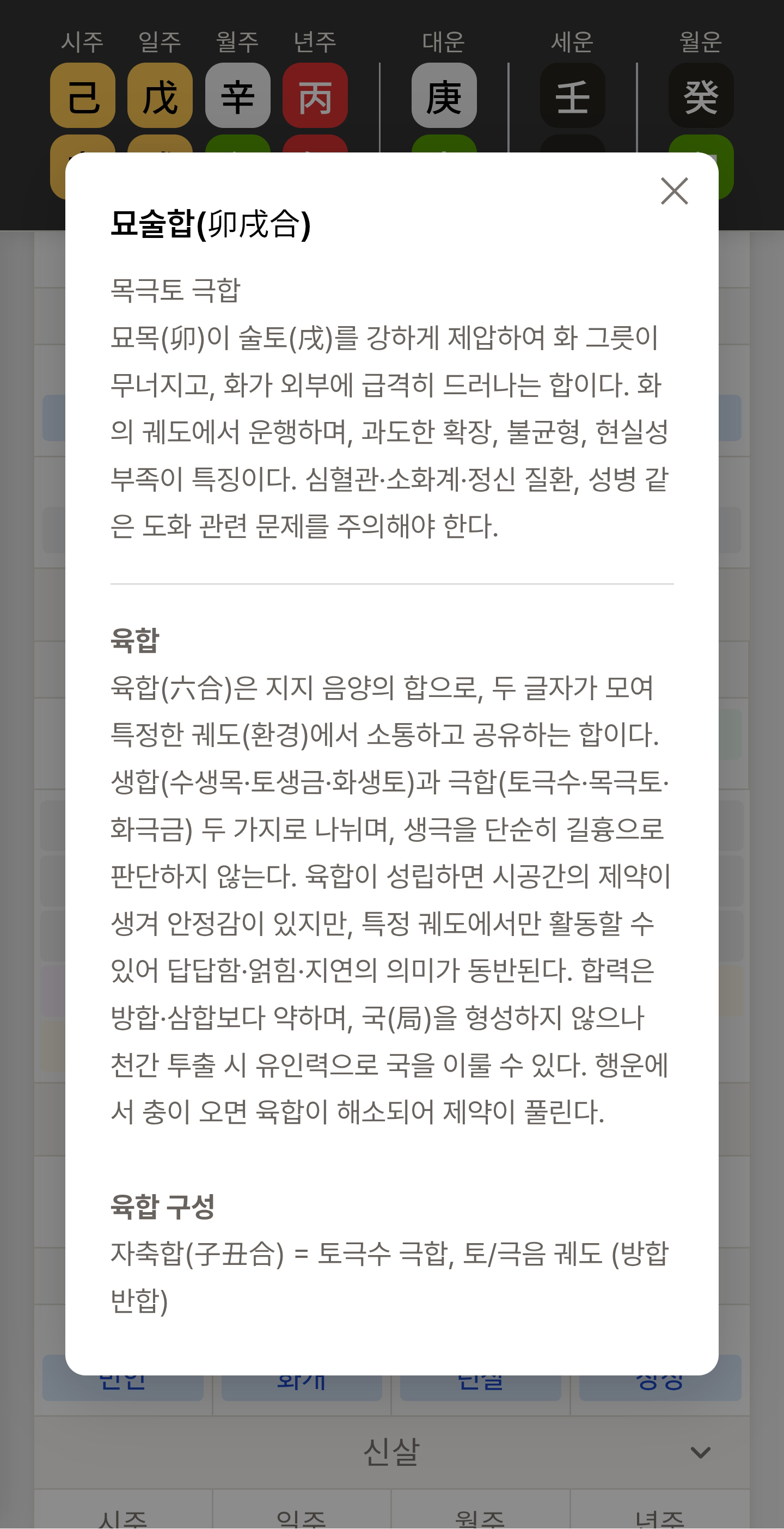 - 천간의 합·충·극과 지지의 방합·삼합·형·충·파·해를 정밀하게 분석하여 표시합니다. 특히 떨어져 있는(원격된) 작용은 회색으로 처리하여, 사주 원국의 구조를 한눈에 직관적으로 파악할 수 있습니다.