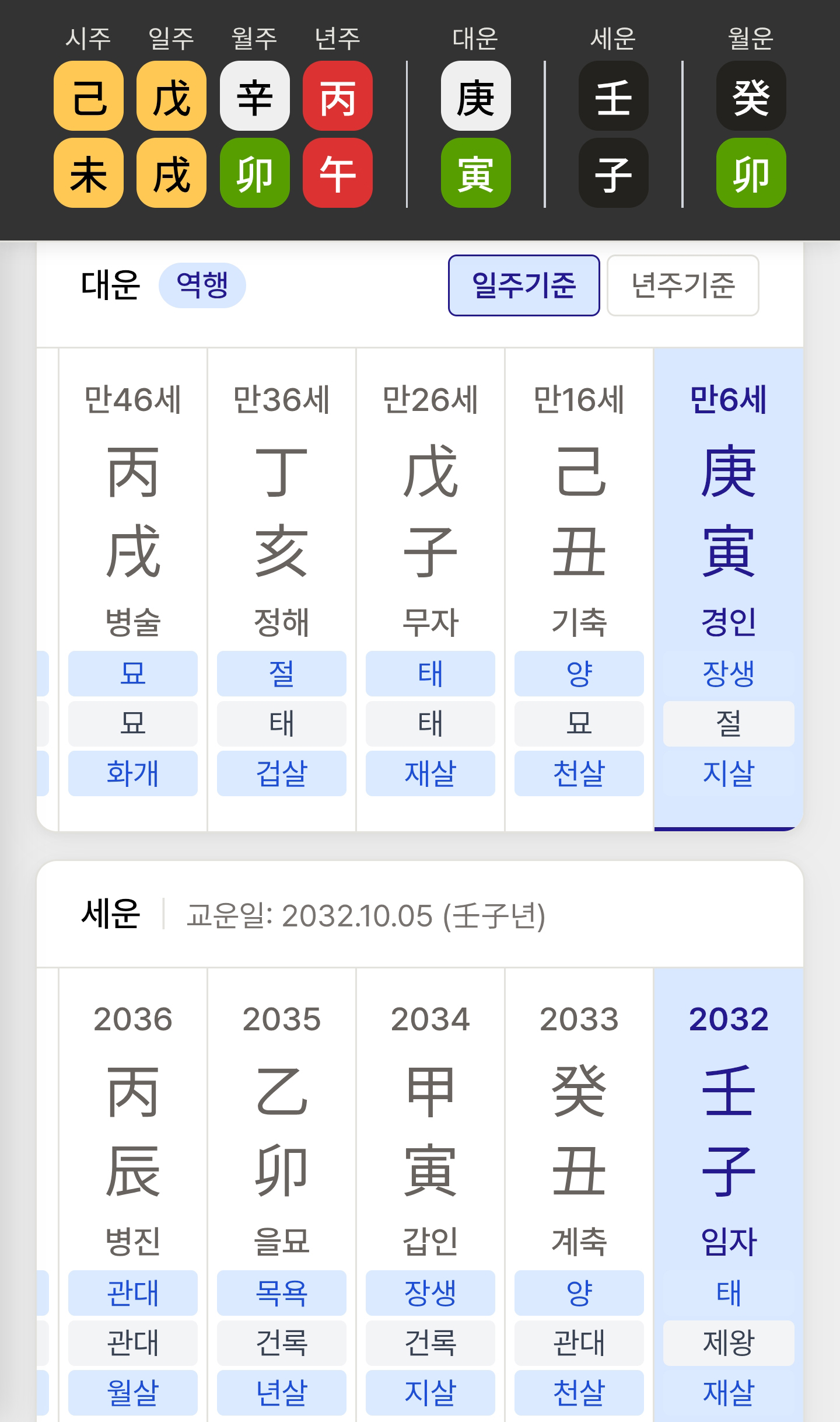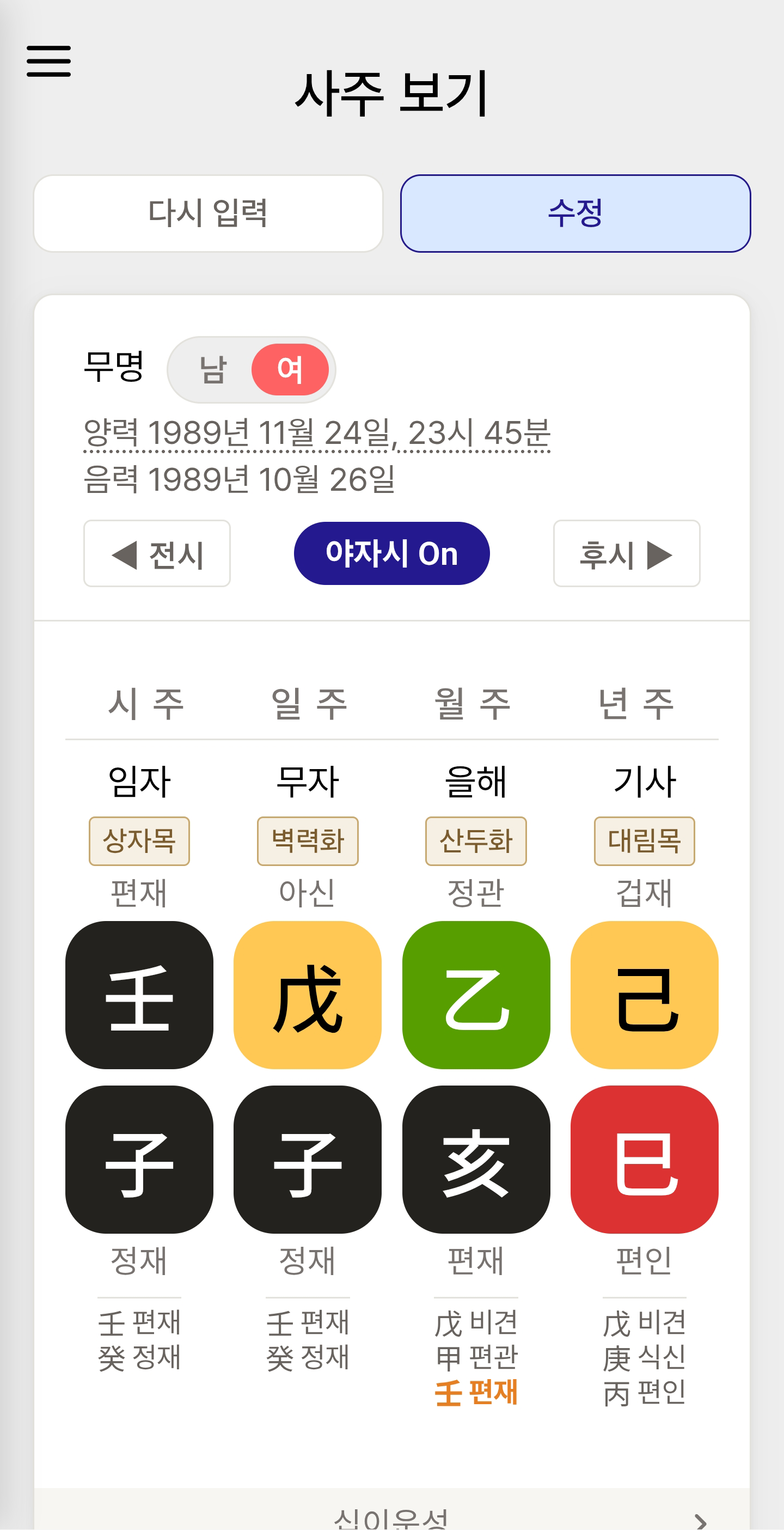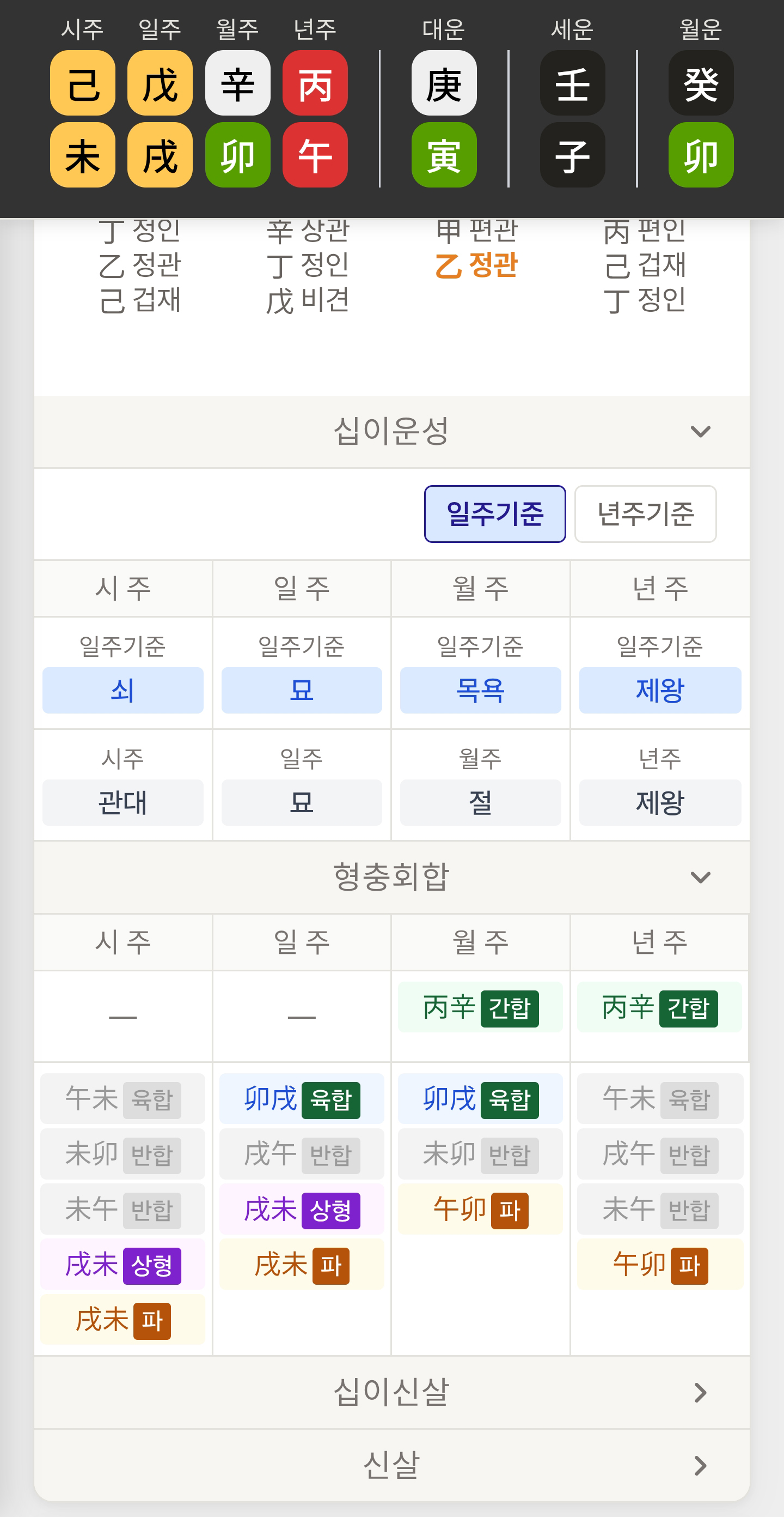 - 십이운성 및 십이신살의 기준을 일주와 년주로 자유롭게 변경하며 대조할 수 있습니다. 해석의 관점을 유연하게 전환할 수 있어 편리합니다.