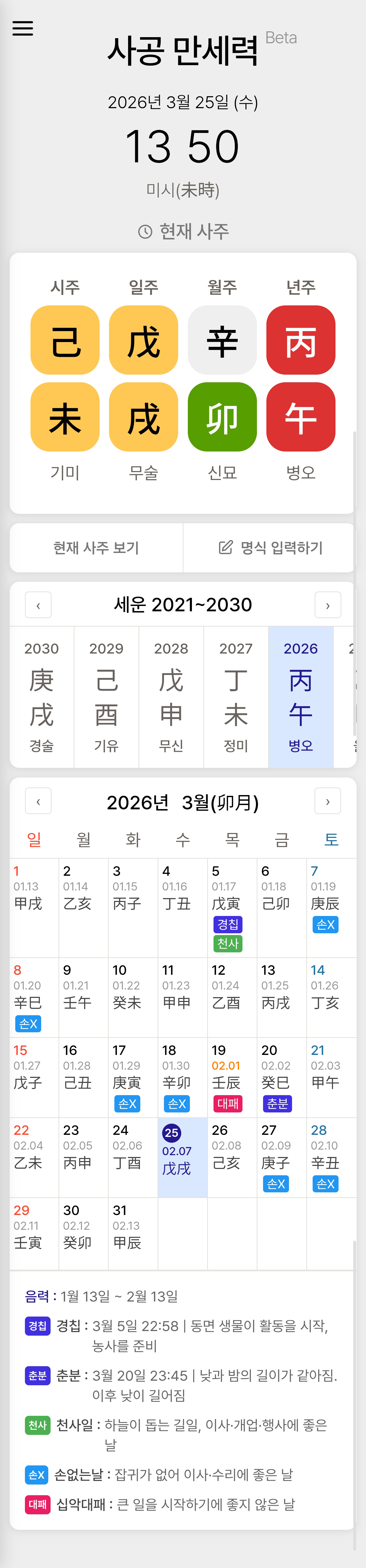 사공만세력은 정확한 사주 계산과 실용적인 편의 기능을 갖춘 무료 만세력입니다. 사주명리 학습과 실전 감명에 도움이 되기를 바라며, 앞으로도 더 나은 서비스로 발전시켜 나가겠습니다. 사용해 보시고, 의견이나 개선 사항이 있으시면 언제든 알려주세요.