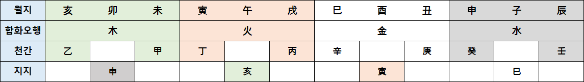 지지의 목 기운을 생하는 오행은 수(水)입니다. 같은 삼합의 논리에서 수(水)의 삼합은 신자진(申子辰)입니다.